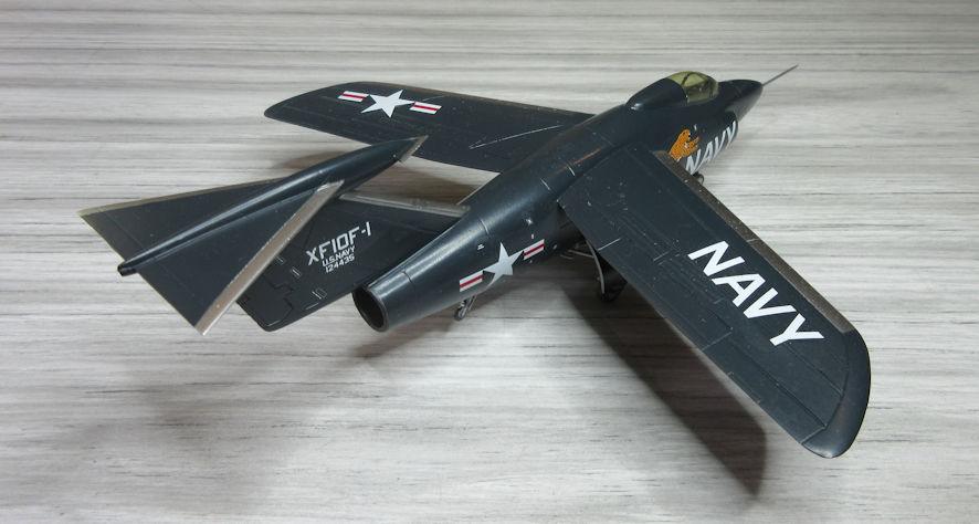 The urge to paint aeroplanes Deep Sea Blue continues and this time goes to extremes with a model of a particularly interesting but flawed aeroplane, the Grumman XF10F. This was a variable geometry fighter designed for the US Navy which was worried that the new jet fighters were flying too fast to land on the aircraft carriers of the time, so if an aeroplane could have a larger wingspan to land on carriers and a swept back wing to fly faster that would solve two problems in one aeroplane. Unfortunately for the Navy the theory didn’t work out as had been hoped and only one XF10F flew before the project was abandoned.