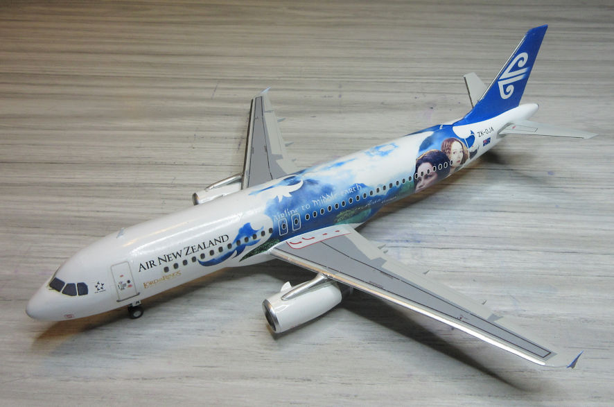 Here’s another of Zvezda’s 1/144 Airbus A.320s, this time in the special Air New Zealand livery of ‘Airline to Middle Earth’ that ZK-OJA was decorated in the period around 2004. The decals come from PAS who make some very nice decals of all kinds of desirable airliners. I was not planning to make this particular model until I found myself looking through the PAS on-line catalogue and could not resist it. The model was made straight out of the box and, as usual, finished in Tamiya Pure White rattle can lacquer an Airbus gray for the flying surfaces.