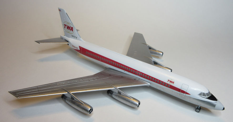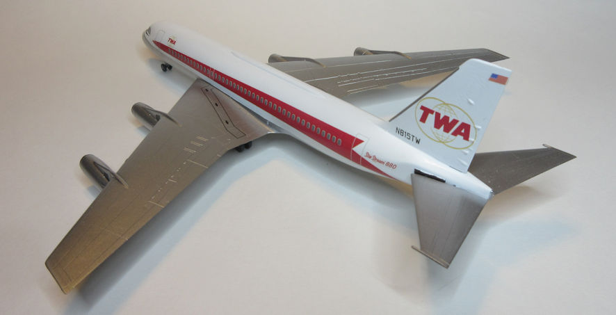 I experimented with some SMS Aluminum lacquer this time and was not disappointed. The white upper fuselage was painted in the customary Tamiya Pure White. Despite having some aftermarket decals fot Convair 880s I decided to use the decals that come in the TWA kit. The end result is very attractive, I think.