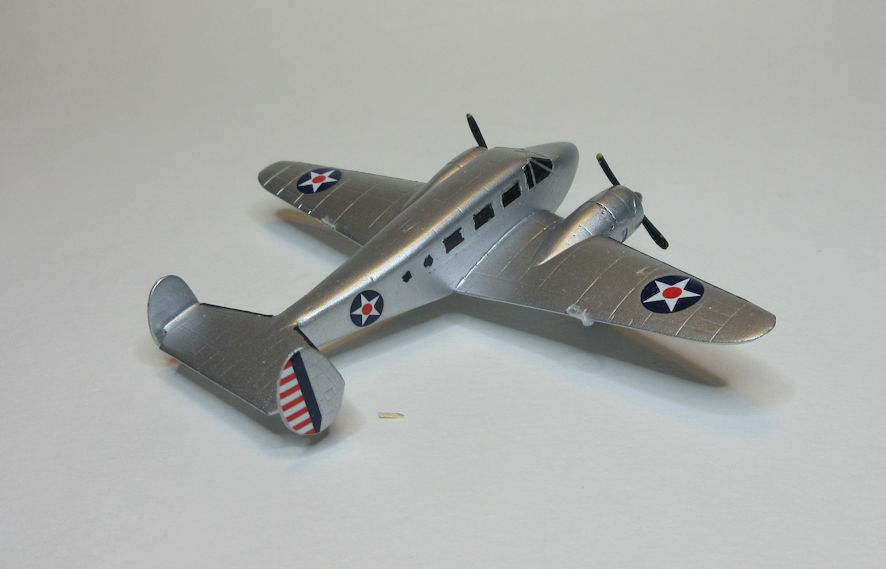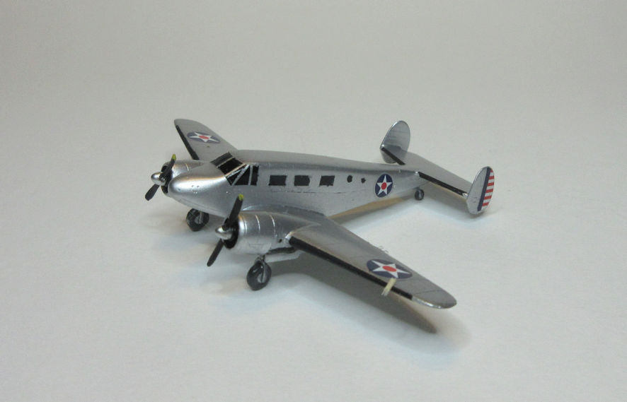 While we’re in resin kits in 1/144 here is another of the Anigrand ‘bonus’ kits. In that box it is said to be a Beech F-2 photo-reconnaissance aeroplane which is a version of the Beech C-45 which is, in turn, a military version of the gorgeous Beech 18 light transport. I gave some thought to trying to find an Australian livery for this one but the ones I found were all too complex for me to do in this scale so I simply used the decals that came with the kit, which are generic but look fairly attractive. It looks more or less like a Beech 18 if you don’t look too hard.
