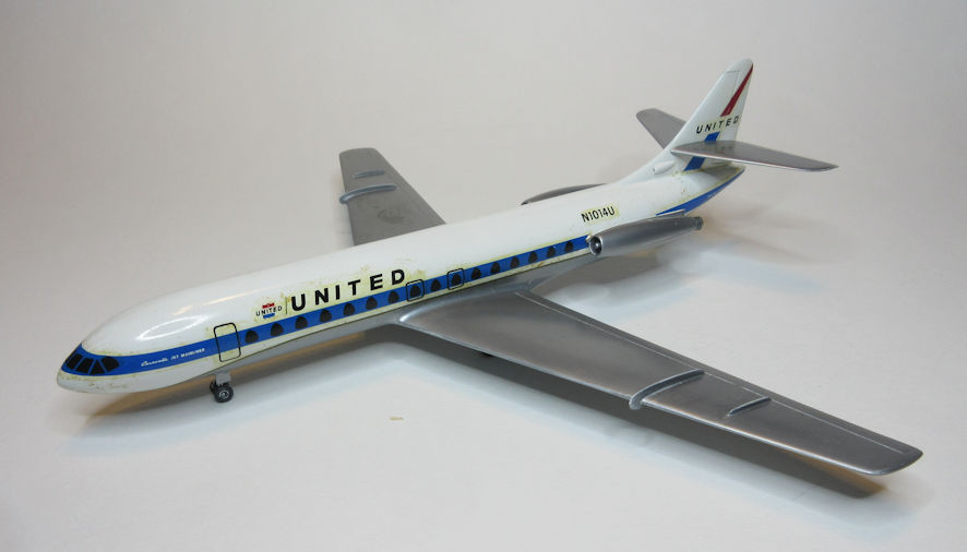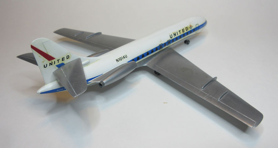 Here is the ancient 1/144 Airfix Sud Aviation Caravelle kit which wasn’t so old when I made this model in 1984. If my memory is correct, this is the first airliner model I completed and, in this United Airliners livery, is probably the first model on which I used after-market decals. It’s interesting to see that the white paint has not yellowed after all these years, many airliners I’ve made much more recently have gone remarkably yellow. On the other hand, the decals have shown signs of decay though it may be the glue that has yellowed rather than the decals themselves.