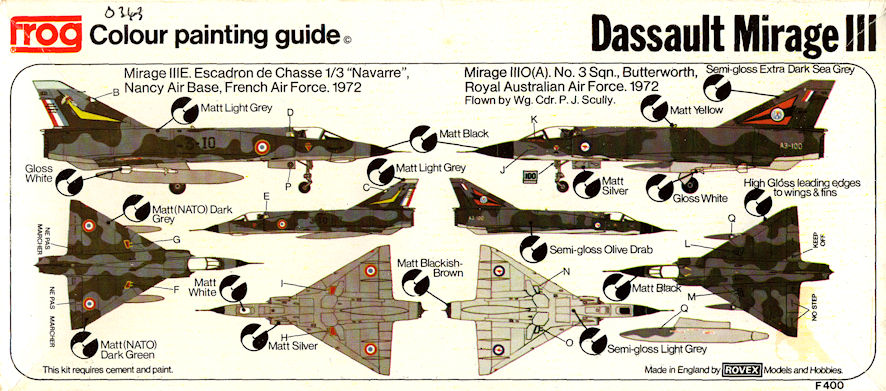 A decade or so later Frog announced it would be releasing a Mirage III with alternative decals for a French Mirage IIIE or an Australian Mirage IIIO. I rushed to the shop, bought it and took it home to make. I still have it. The nose probe has long since gone, as has one of the Sidewinders and other bits and pieces. In retrospect it is not a great kit, but in the days before the Revell and Heller kits it was a good basic kit that did the job. It still is. Of course there is now the High Planes [limited run] kit which is, if their earlier kits are anything to go by, really first class if a little challenging to put together.