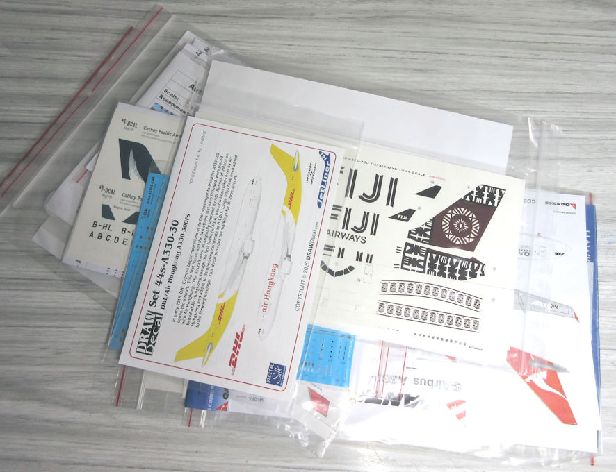 One more decal decision had to be made. Although each of these A.330s wore different liveries they all had the same windows, wing walkways lines and smaller details, but each of the decal makers portrayed them slightly differently in their decal sheets. So that they looked identical in these details it was necessary to buy five sheets of detail decals as well. After a lot more hunting around on the internet I decided that the F-Decals sets were the best and ordered five of them. They came with liveries for various airlines as well, which might prove useful if anything goes wrong with my Grand Plan.