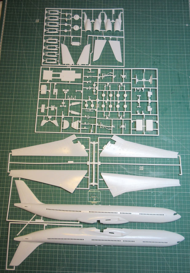 The kit comes in the A.330-300 version but the conversion to a shorter A.330-200 is relatively simple and involves taking slices out of the fuselages before and after the wings and replacing the kit tail with a larger aftermarket -200 tail. These modifications present no problems, providing that you know what you are doing and are careful about it.
