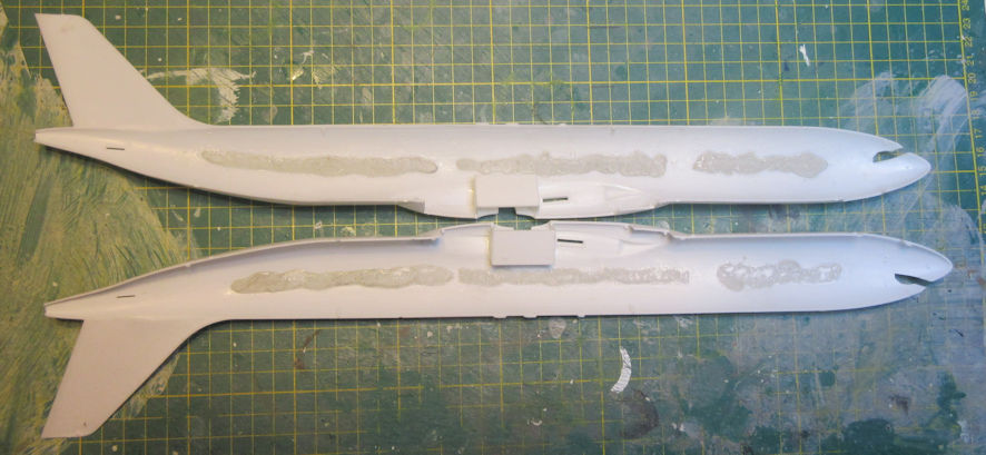 After you’ve done this it is also necessary to fill the gaping holes where the tails used to be on the three kits that are going to become A.330-200s. I do this with another generous blob of epoxy putty so that it will be a strong anchor for the new aftermarket tails when it is sets. Doing this is the same as putting in the nose weights, press the putty into one side, dampen the other half and then push them together.
