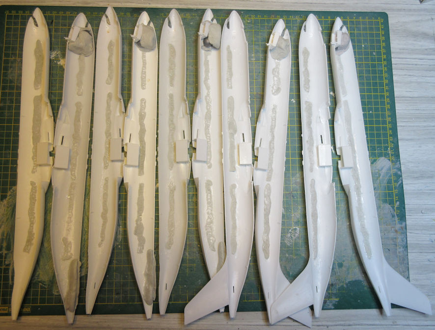 All I can say is that I worked as carefully as I could but the joint between the two fuselage halves in all five models ended up in a pitiful state. A lot of filling and sanding will be required, but let’s deal with that later.