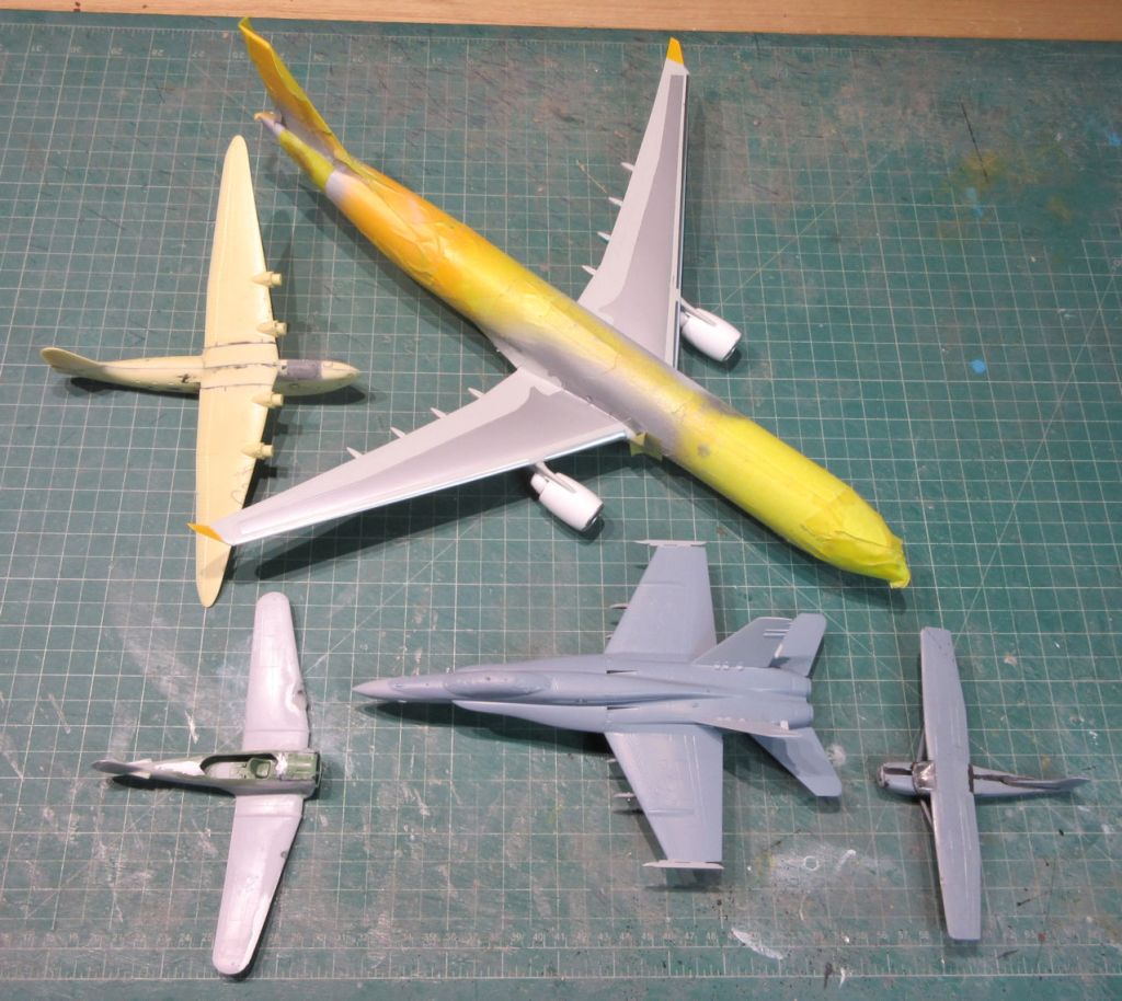 There’s not been much progress on the A.330. When I unmasked the engine pods I found there had been a lot of unsightly bleed through from other colours so I’ve put it aside until I work up enthusiasm for solving the problem. I’ve got the itch to make some RAAF aircraft this year, of which the Hudson is the first. The F-18A will represent what they looked like when they began entering service with the RAAF in the 1980s whereas the Wirraway will represent one in service in New Guinea during World War II. (It’s a fairly challenging MPM kit that I’ve had on the back burner for a long time and have now decided to push along to completion despite its challenges.) The yellow model ia an Anigrand 1/144 Vought Sikorsky VS-44 pre-war flying boat that I was inspired to make by being loaned a book on the subject and the Cessna 180 will be completed using some nice Hawkeye decals for a TAA aircraft.