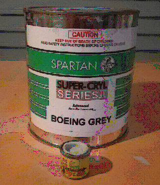 But it was that easy. When I went back he had paint cans with ‘Boeing Grey’ and ‘Airbus Industrie Gray’ labels on them. I also got a can of white and a can of thinner to thin the paint to the recommended consistency. That, and some mixing cups and a couple of other spray cans cost me a little over $300, but we amused ourselves by calculating that if I’d continued to buy my Boeing Grey in tinlets it would have cost me around $1500 to buy the same amount, just of the Boeing paint. Not a bad deal.