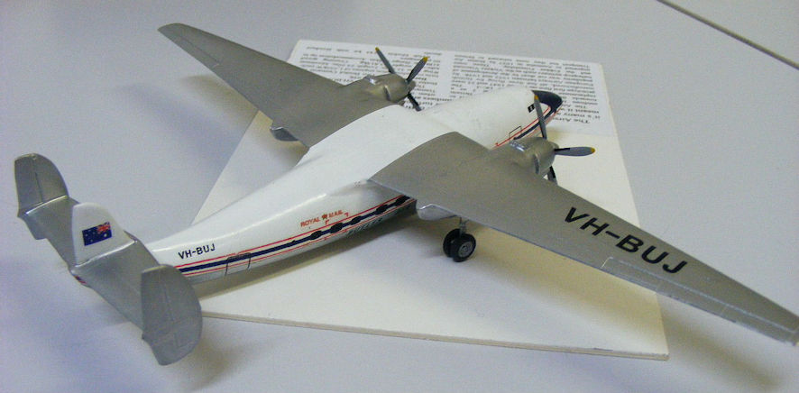 Unlike the 1/72 kit that VH-WAL struggled with, the 1/144 Welsh Models kit is simplicity itself. The whole tail unit comes in one intricately moulded resin part and the rest of the airframe comprised two vacformed fuselage halves and two resin wings. The propellers and undercarriage come in white metal. The whole process of making the model was simplicity itself, the decals themselves went on like a dream and the finished model looks very nice.