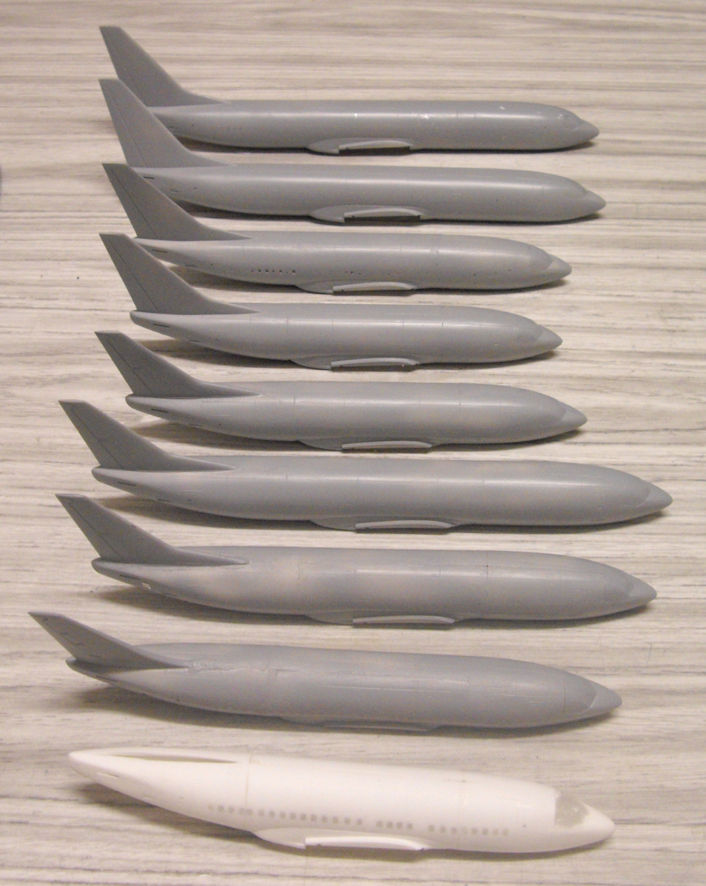 To overcome the problem of three different fuselage shapes of the three different 737 kits the simple thing is to convert one basic shape to all nine 737 versions. The best kit, and the most readily available, is the Revell 737-800 kit but obtaining nine of them would not be easy or cheap, except for the fact that several years ago I acquired from the United States four or five kits in their plastic bags without instructions, decals or box at a good price and Airline Hobby Supplies were selling a version of the Revell kit at a good price, so I got four more to complete the set.