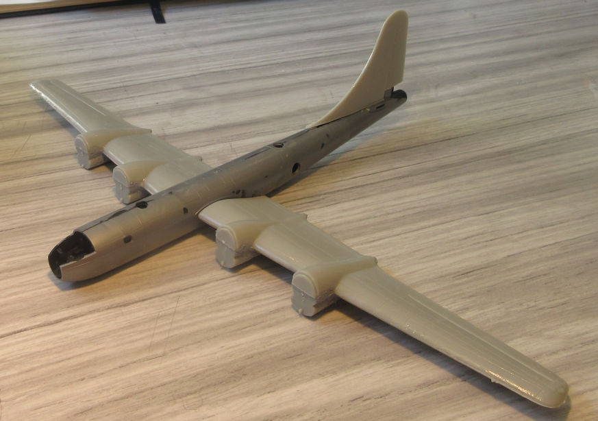 So, after a fair bit if filling and sanding to merge the parts from the two kits, I ended up with something that looks more like a B-50 than a B-29.