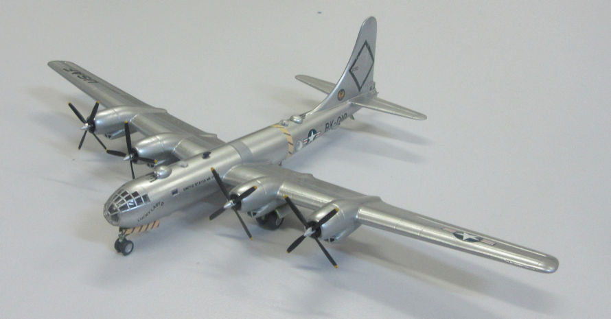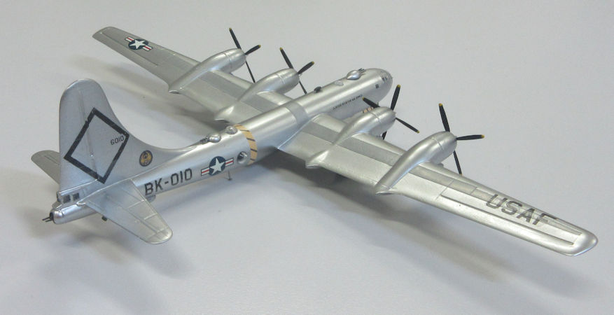 Perhaps I made this model simply because I could. I had a spare Fujimi 1/144 B-29 and a spare Minicraft 1/144 Boeing 377, and it is a well known fact that the Boeing 377 was a civil version of the C-97 which was a cargo version of the B-50. So, what would happen if I took parts of these two kits and put them together? Why, a B-50 of course!