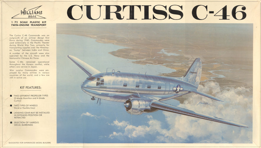 Like its smaller compatriot the Douglas C-47, the C-46 began life as a passenger aeroplane, first flying in March 1940. It was, however, larger than the C-47 (or Douglas DC-3) with capacity to carry 36 passengers rather than 21. The large capacity fuselage soon attracted the attention of the United States military authorities for cargo, transport and casualty evacuation and it was ordered into production. The first C-46s entered service in July 1942 and were, at the time, the largest and heaviest two engines aeroplane in American service. They soon proved to be such a valuable transport in the Pacific theatre that well over 3 000 were built.