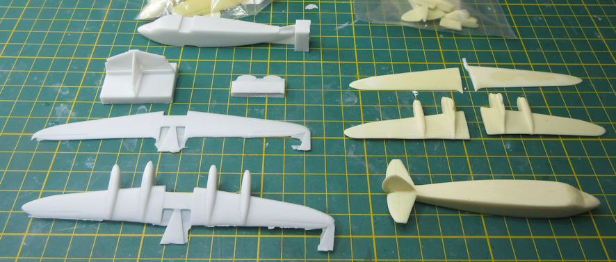 These kits are frightening in their simplicity and, strangely, I got two different versions of the kit. One has a fuselage with a separate tail, lower wings moulded to the fuselage and a one piece upper wing that slots into the fuselage. The other has a fuselage with a tail and four separate wings. Both have shortened tail fins with the big endplates to attach, come with a few lengths of brass wire of two different thicknesses and no propeller blades. The decals are for Railway Air Services, a British airline, and very nicely printed but of little use to me apart from the black windows.