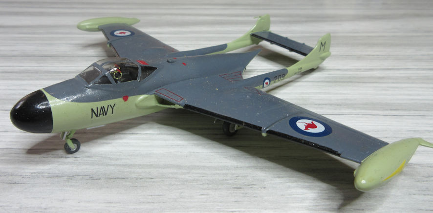 Everything else that went wrong with this model I blame on the cat. I came home one day to find that ‘Charlie the Wonder Kat’ (it’s a wonder he’s still alive) had decided to fiddle about with the half completed Sea Venom kit which involved scrabbling around in the open box with his paws, throwing all the bits onto the floor, shredding the instruction sheet and putting some memorable claw marks through the decal sheet as well. After that getting everything together in the right place was a bit of a raffle so if you put my Sea Venom alongside a real one you could have one of those competitions where you have to spot the differences. Let me help you with just a few. First, the pitot tube on the kit is flimsy and I replaced it with a bit of craft wire (you learn things from watching ‘Better Homes and Gardens’), it’s supposed to go on the port fin but I got it wrong and mine’s on the starboard fin. Second, the top side grey camouflage on the pylons is the wrong shape. Third, the nose undercarriage door is on the wrong side. There are more, but I’d prefer not to have to give you all the details here. (There’s a lesson here, check all your references before rather than after you do something…).
