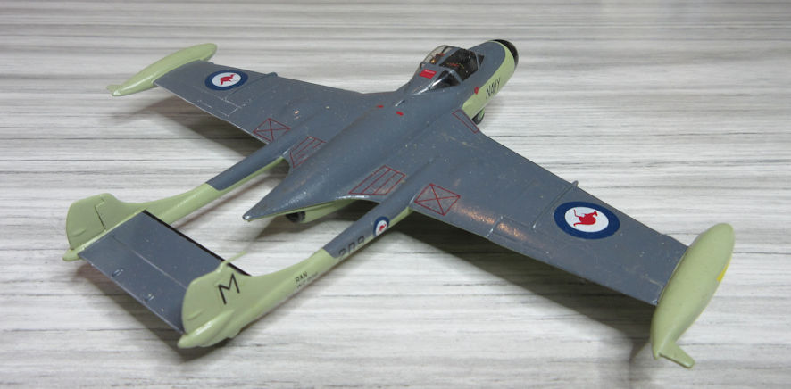 I’m still a fan of Frog kits after all these years, though sometimes I wonder why. They gave you a good honest basis on which to make a good model, nothing fancy but generally accurate enough. Their decal sheets were like the kits themselves, good for their time. The forward fuselage shape is not quite right, a little too rounded for my taste but it would take a fair bit of work to make it right. It would also be nice if the kit supplied the vanes that go in the air intakes too. In terms of construction there’s nothing that needs comment on, it goes together easily though you have to spend a bit of time tidying up seams and bits where the parts don’t meet with Tamiya-like precision. There’s nothing in the cockpit to speak of, I was tempted to lash out with a couple of old white metal Martin Baker Mk.4 ejector seats I’d been saving up but in the end I was too frugal and used the ones from the kit painted black with brass seat handles I’d picked up somewhere. The other thing I had to change was the cockpit canopy, the one supplied in the kit is so thick that it won’t fit with the ejector seats in place, so I had to fish out an old Falcon set of vac-formed canopies that had one for the Sea Venom FAW.21 and use that. It came up looking nicely.