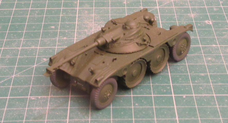 There aren’t many parts in this kit and they aren’t hard to put together. The only fiddly bit is in drilling out the gun barrel and opening up the muzzle brake. The hull is moulded in one part, a very nice piece of work too. All you have to do is glue the gun barrel to the turret, glue the wheels to the hull and glue the turret to the hull. And that’s it. As for colours, the instruction sheet has nothing to say on the subject and photographs of EBRs in action are black and white and colour photos are of museum examples. They’re all green, but different shades of green. I resolved this conundrum by picking the same shade of green that I’d painted an ARL 44 in a couple of months back. When that was dry I painted the wheels the usual Humbrol 67 and when that was dry I glued all the parts together, and that was that. To add a tiny touch reality to the model I added a couple of French military number plates that apparently go on trucks, but who can read the numbers in that scale.