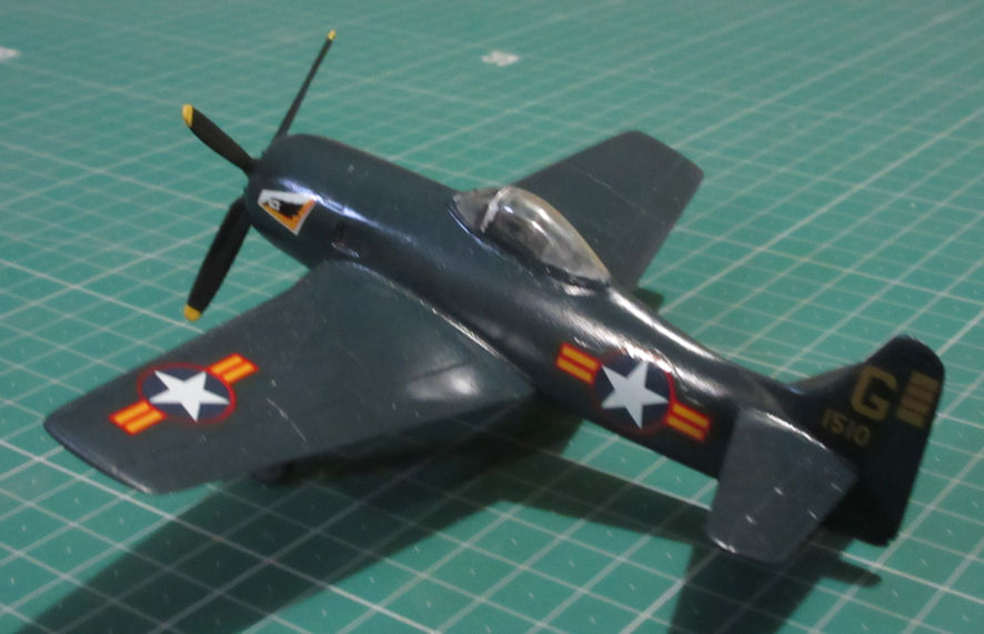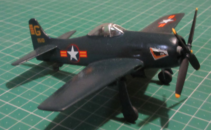The United State Navy ordered two F8F prototypes on 27 November 1943 and the first one flew on 21 August 1944. It had the same engine as the F6F but was 20 per cent lighter and its rate of climb was 30 per cent greater, more than meeting the specifications set for it. Deliveries of production aircraft commenced in February 1945 and it began equipping fighter squadrons VF-19 and VF-21 in May 1945 but they were still working up to operational status when the war ended. Production orders had been placed for 2023 F8Fs but, with the end of the war, production was reduced to 1266, the last one produced in May 1949. Despite its spectacular performance the F8F could not compete with the new jet engined fighters that began entering service in the second half of the 1940s but even so it was produced in several versions. The first, the standard F8F-1 followed by the F8F-1B which replaced the -1 version’s four machine guns with four 20mm cannon to give it greater firepower. Next came the F8F-1N that was equipped as a night fighter and finally the F8F-2 with a redesigned engine cowling and enlarged tail fin for greater stability. By the time production ended the F8F had served with 24 US Navy squadrons but they had all been withdrawn from service by late 1952 so it never saw combat with the navy.