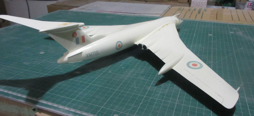 In its time Matchbox made some excellent kits and some fairly dreadful ones, with the Victor they managed to combine excellent and dreadful in the same kit. The decal sheet, for example, is very detailed and includes all kinds of stencilling and markings for the tanker version, the undercarriage is generally good and the overall shape is fairly good. But, my goodness, it must have taken some stroke of genius to make the air intakes as bad as they did – you couldn’t do that kind of thing by accident. If I had realised how bad they were I would have gone to the trouble of cutting them out of the wing leading edges and making them up as individual units before gluing them back in place. As it was, I had glued the wings together before I realised their full awfulness and all I could do was push some filler into the gaping recesses in the hope of making some improvement. The same could be said for the ailerons and rudder which are separate items that are a very poor fit. I filled the gaps with some well glued plastic card and later sanded everything to the right shape.