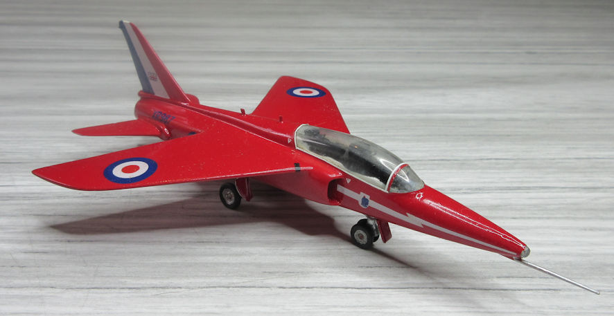 As you would expect, the Airfix kit of the Red Arrows comes moulded in red plastic and it is not hard to imagine them selling like hot-cakes at a display where the Red Arrows had appeared. I’d guess that this kit was released in the early to mid 1960s when the Gnat was still new and exciting. This wasn’t the golden era of Airfix kits although the thing isn’t too bad. The bits fit together tolerably well but the intakes and the exhaust need to be thinned down to look realistic. It would be best to make sure that the undercarriage legs line up properly so the usual problem of kits with narrow undercarriages – that they don’t sit square on the ground – doesn’t rear it’s ugly head. (I didn’t and the result is that one of the wheels on my model now has a flat tyre so the wings are level with the ground.) Perhaps the most important thing to do is rummage through the spares box to find a couple of relatively decent looking ejector seats to replace the puny looking little things supplied in the kit. Pictures show that the ejector seats seems to have taken up a massive amount of the space in the cockpit so while the seats in the Airfix kit might have made the cockpit more comfortable for the pilots they wouldn’t have done much good in an emergency.