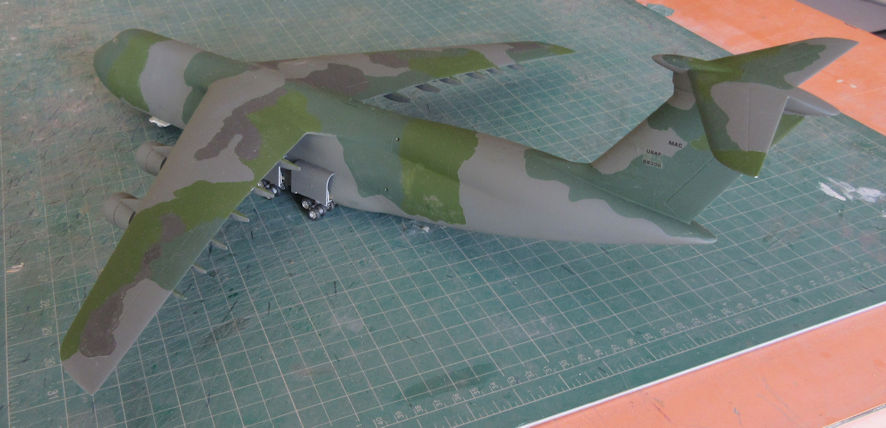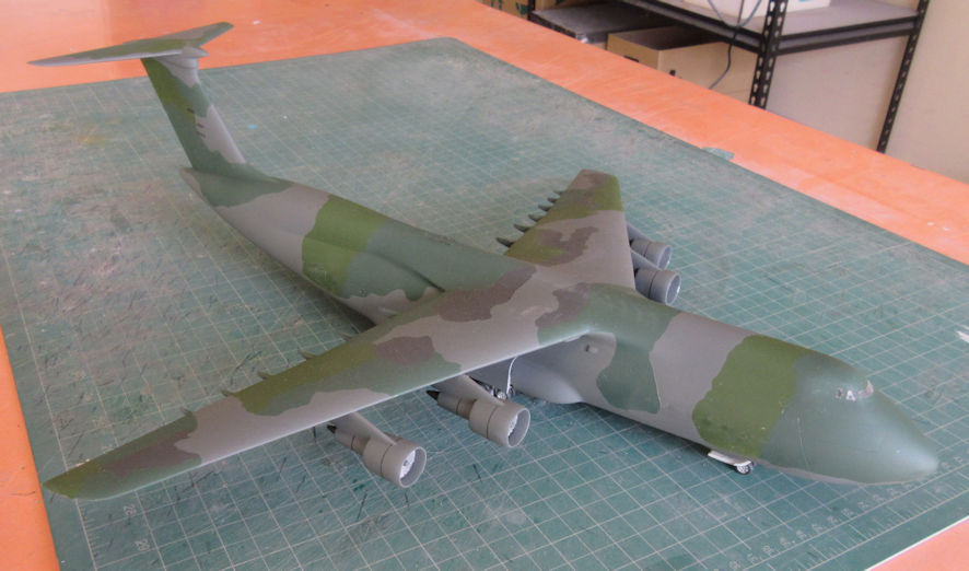 The point about 1/144 aeroplanes is not really the detailing that you’d put into a 1/48 or even a 1/72 one, it is the finishing. This brought me to the more challenging parts of the job. The first was to spend hours peering at photographs of C-5s in the ‘Euro One’ scheme and drawing up a plan showing where the colours go on it. It appears that there are some differences between individual aeroplanes but that they all follow a similar pattern so I was able to come up with sort of generic plan that looks like just about all C-5s in the scheme, but doesn’t represent a particular one. This turned out to be not such a bad thing because, when it came to drawing up the decal sheet on the computer, I could not find a photograph clear enough to identify the serial number, so I made one up that is in the general range of the C-5As. The most difficult part of drawing up the decal sheet was getting the insignias right so I scanned a standard star-and-bar decal and redrew it into the form that was used on the C-5s. I also drew up some lines to go around the engine nacelles and the tail codes using a suitable font from the range available on the computer. None of this was difficult but it ate up an evening or two.