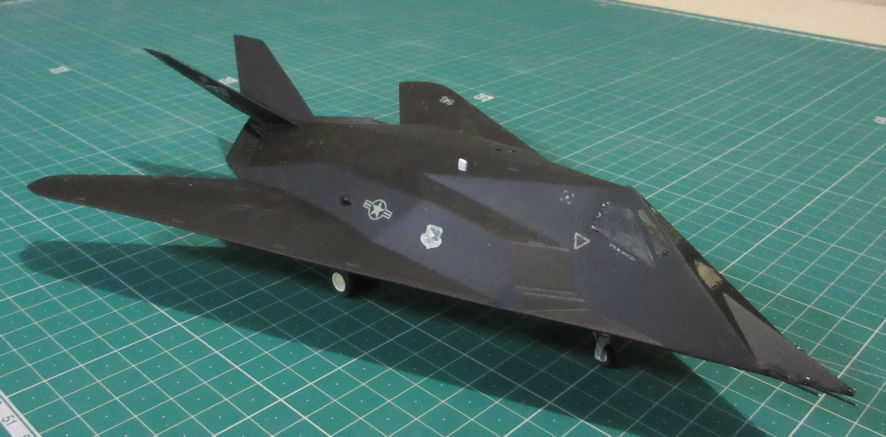 Talk about ugly! In comparison this aeroplane makes those famous ‘ugly’ French aeroplanes of the interwar period look like aerodynamic perfection in flight. Still, ugly or not, the F-117A is a significant aeroplane for many reasons so I was bound to make it sooner or later. This is one of those kits I picked up at a swap-meet for a fairly minimal price and really, it isn’t worth too much either. The shape of the aeroplane means that it really has two parts, the upper fuselage and wings and the lower fuselage and wings with a few other bits and pieces tossed in. The decal sheet is also minimal, not surprising, and offers a couple of options but since the major difference is in the ‘nose are’ but that is carried on the weapons bay doors and can only be seen when they are open. So there is hardly anything of note about the kit except that it’s size is a mreinder that this is not a small aeroplane.