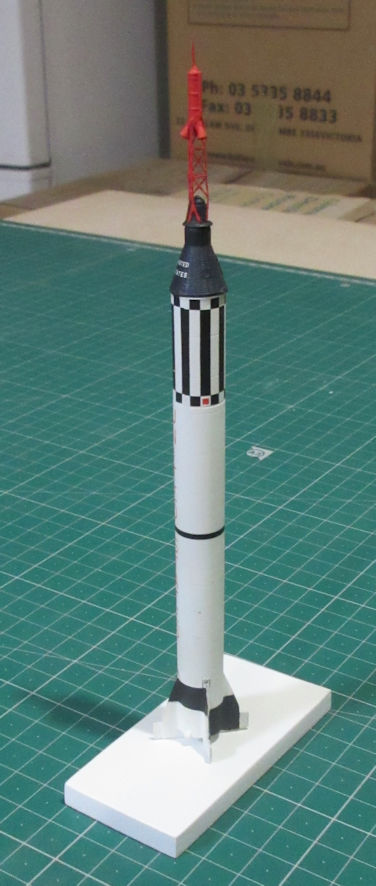 The most difficult part of making this kit is the painting and decaling. The decals include the upper black and white markings but the ones around the fins have to be masked. The decals themselves are almost too thin and part of one of the ‘United States’ running up the rocket side folded over and would not unfold, no matter how harshly I spoke to it. Fortunately I had bought a colour laser printer only days before and had scanned the decals before I began applying. It is impossible to tell the new decal from the old and the end result is a fine looking little model.
