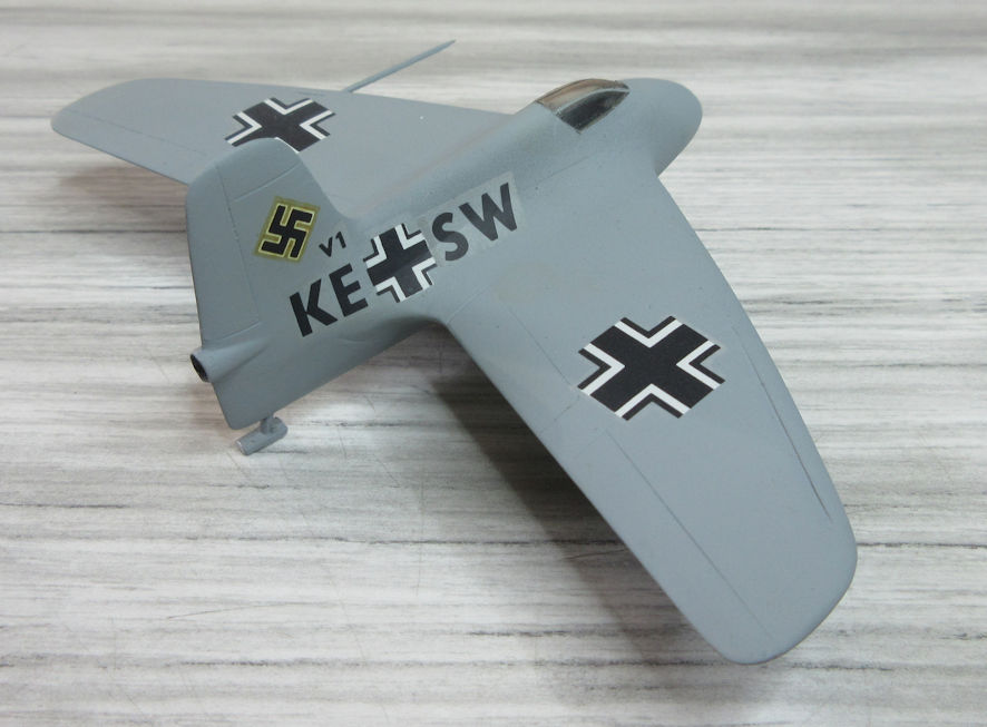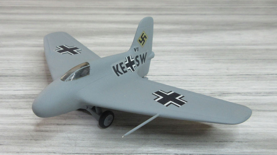 As for painting, nothing could be simpler thought the instructions are confusing. The Me163V-1 is all-over grey and the instructions recommend Humbrol 92 as the correct colour, but that is far too dark. The instruction sheet also suggests that the FS colour equivalent is 36280 which is a much lighter shade than Humbrol 92. After a bit of thought I decided to use FS 36270 which is a touch lighter again and doesn’t look too bad. After that I used a bit of silver decal for the landing skid, and that’s it. The markings on the decal sheet look a bit big to me but the decals are otherwise good and go on well. I also used swastikas from the spares box rather than the odd shaped things on the decal sheet. The end result is a pretty little model.