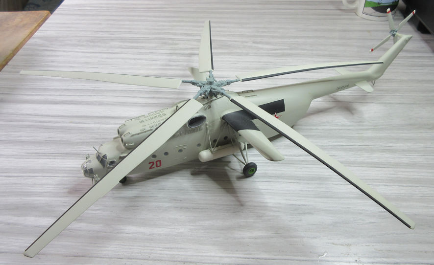 Then I decided to get serious about the colours and markings. The instruction sheet gave options for Russian, Chinese and North Vietnamese versions but I discovered the decal sheet only offered Russian decals, and then not the ones the instruction sheet suggested. Obviously somebody had made off with the kit’s decal sheet and substituted something from their spares box, hence the cheapness of the kit. I’m all smiles by this stage! Still, a cruise around the internet looking at as many pictures of Mi-6s as I could find showed that just about all the Russians ones were painted the same shade of light grey and that there was a great variation in the markings that appeared on them, so I ended up using the decals that had come with the kit and made up some serial numbers to suit on this computer. There was also the business of masking the nose and cockpit transparencies, that involved a little blood and a lot of swearing.
