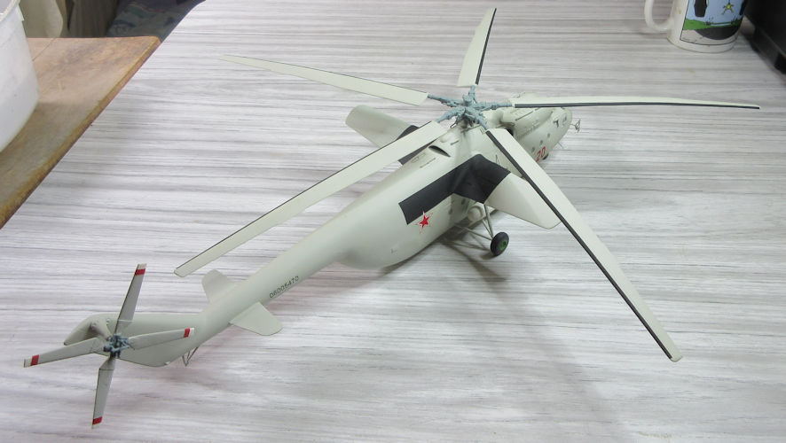 The rotor assembly went together alright but the soft plastic made the tail rotor look somewhat limp before I stiffened it up with a bit of wire at the join with the fuselage. I also used some wire to strengthen the join between the main rotor and the fuselage but I can only wonder what gravity and the passage of time will do to the rotor blades themselves. Let’s no think about that. Instead, the end result looks rather BIG and not entirely unattractive.