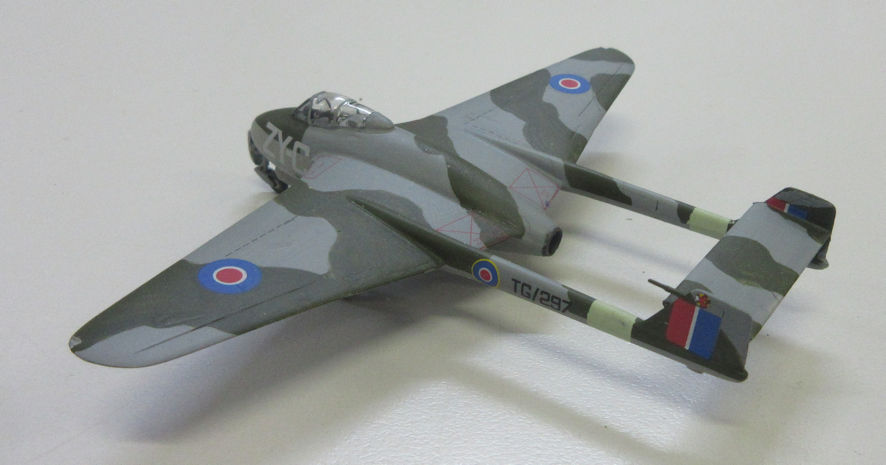 Like all good modellers I started out experimenting with hand painting with these new paints on bits of scrap plastic, and that went well enough. However, when it came to painting models, that was going to be a different thing. If I had had any brains I would have started with something simple of one or two colours. But I’d had this desire to make early jet fighters and fished out the Dragon Meteor F.1, which is actually a very nice kit. Then, in an unaccountable attack of insanity, I decided to make the Amodel Vampire F.1 as well, which is not such a nice kit. Having got the models ready to be painted, and having given them a coat of Tamiya primer, I embarked on the hand painting process. What I learned very quickly was that the round paint brushes that I has used for decades were not so good at spreading around acrylic paint. I quickly discovered that this new paints flows from the brush quite differently from enamel paint, I guess the oil content of enamel makes it easier to apply whereas the acrylic paint seems more like a thin paste that has to be spread around quite differently. ‘Spread around’ might be the best way of describing the process. What also made the business difficult was the need to apply six different colours to the Meteor and Vampire, which came up looking not-so-bad with a lot of touching up.