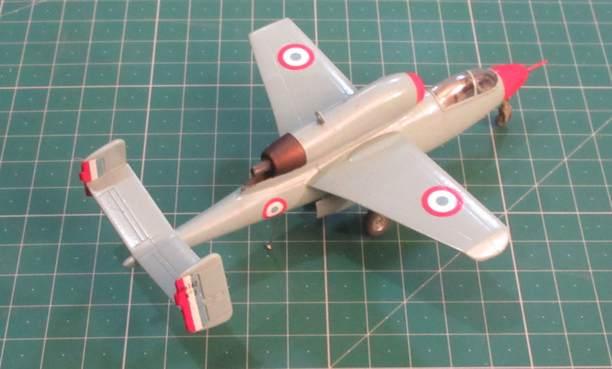 To make the next experiment easier I went out and bought the new Airfix F4F-4 – which is an excellent little kit – and a big flat paint brush. This model needed only two colours in big broad swathes and that went very nicely. Having been emboldened by this experience I bought myself a set of Luftwaffe paints and then rustled around in my Treasure and found the Hobby Boss Heinkel He162. I also had a look through my decal collection to see what options I had and found a nice sheet of decals for German aircraft flown by the French after the war. It turned out that one of these He162s had been painted up for a special display in 1948 in red and blue. Who could resist that. However, having no suitable acrylic paint for this project I found myself back painting in enamels, thinned down to just the right consistency and run through my airbrush.