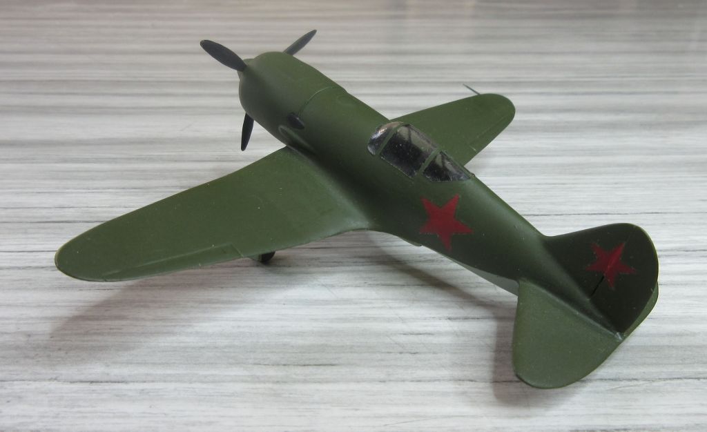 Painting came next. It’s not easy to find a good range of accurate colour paints these days so I was reduced to mixing my own to match the appropriate FS colours for a Russian fighter of that period. I’m not sure what colour the wheel wells should be but I see that a couple of other Russian fighters I made in 1987 have chromate green (more or less) so I trusted my earlier research and used the same colour again. The decal sheet is not very impressive but for a prototype aeroplane all I needed was red stars. The carrier film looked flimsy or non-existent so I brushed over a couple of coats of Microscale Decal Film and the decals settled onto the model better than I expected. Finally I sprayed on a couple of coats of matt varnish, attached the little bits like wheels and undercarriage doors (the main doors needed a lot of trimming to fit properly) and it was all done.