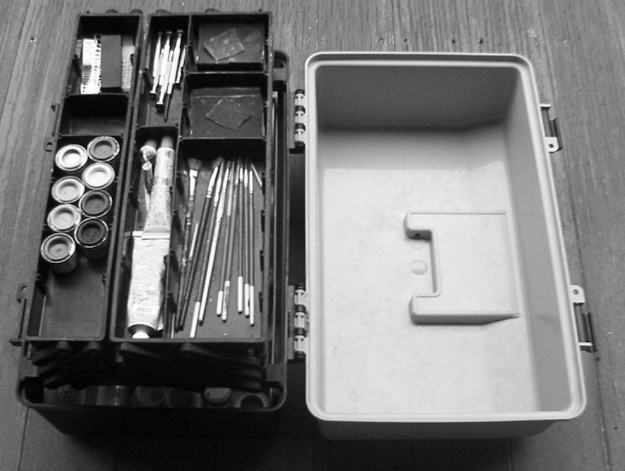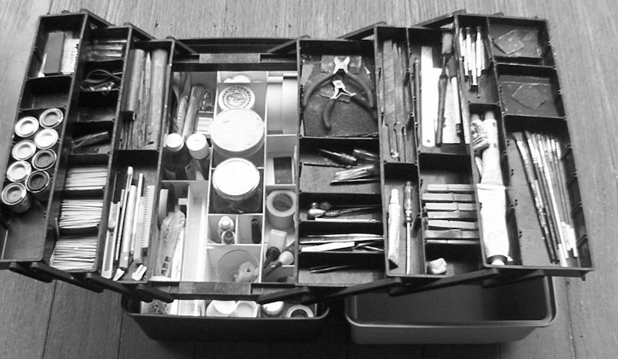In theory everything I needed to make a model was in the box. Over time, however, I came across new tools and new techniques and they went into other boxes that were in easy reach of my work table and, conversely, there were things in my tool box that gradually fell into disuse and gathered dust in there. When it came time to spend a couple of months away from my work table it also became time to have a new look at what was in my tool box, to dispense with things that I no longer used and find space for things that I did use. As a result just about everything I now use regularly is back in my tool box and it is probably a good summary of the tools I use and how I use them. (There are of course, things like boxes of paints and tools like my Dremel that are too big or which I don’t use very often that still have to live outside my tool box, but are still within easy reach.)