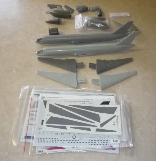 That, at least, was how I thought of myself until recently. I woke one morning with the urge to make a model of a DC-8, one of the most elegant of airliners. Fortunately I have collected a few Minicraft DC-8 kits over the years and read up on all the variants with their different wing and fuselage sizes and engines. However, this thought led to a process in which I find myself working on a set of Boeing airliners. Also, over the years, I’ve collected after-market engine sets that will allow me to make many of the DC-8 versions and they had gone into a box with many other conversion sets for airliners. As I started shuffling through the box there was a plastic bag with two large plastic tubes that kept getting in the way. What was it? Peering at the label on the bag I found it was the fuselage extensions to convert a Minicraft Boing 777-200 into a -300. I pushed it to one side to find another, slightly smaller, conversion kit. What was it? Conversion parts to turn a Revell Boeing 767-300 into a -400 and, after I pushed that to one side, a smaller set that would convert a Minicraft 757-200 into a -300. (I have a vague memory of buying the 767-300 conversion set because I had to find it on ebay, but I’m not sure how the other sets came to be in my box.) Only after they were out of the way could I get to the DC-8 engines. How annoying, I thought, to have all those lovely DC-8 engines covered up by these conversion sets. I only thought momentarily about dropping them in the bin, but the only serious solution to the problem was to actually use them to make models.