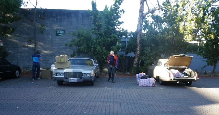 We cruised through the pre-dawn landscape with me feeling as pleased as a MoBster at the Wong emporium. There was enough light to see the landscape and the fog sitting on the ground. The sun rose just as we were coming down the escarpment into Bacchus Marsh, which was fine until we turned off the freeway at Melton to get to the Calder Freeway. We were heading directly in the sun that was sitting just above the horizon and I was glad that Zim was driving and I wasn’t. He probably felt the same way. I was also glad that Zim was driving because he knew where he was going, and I didn’t. I recognised Bell Street when we drove along it and also Box Hill where all the signs are in foreign languages and the Tax Office is just around the corner. Next thing I knew, we pulled into the car park opposite the hall where the swap and sell was to take place. The previous time I’d been there we were greeted with the sight of an oriental gentleman doing his exercises, this time we were greeted with the sight of a vast American automobile about the same vintage as Zim’s Jaguar.