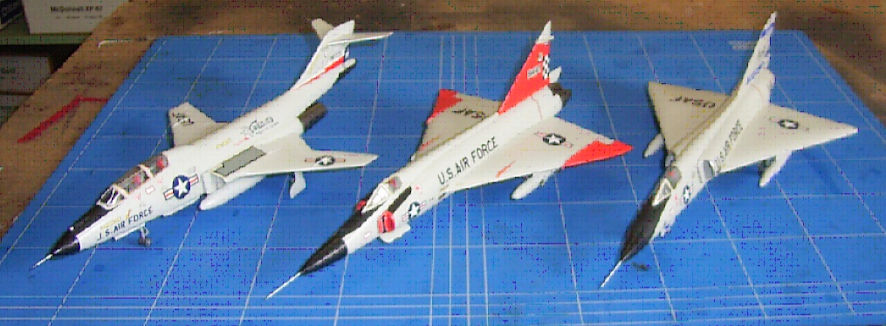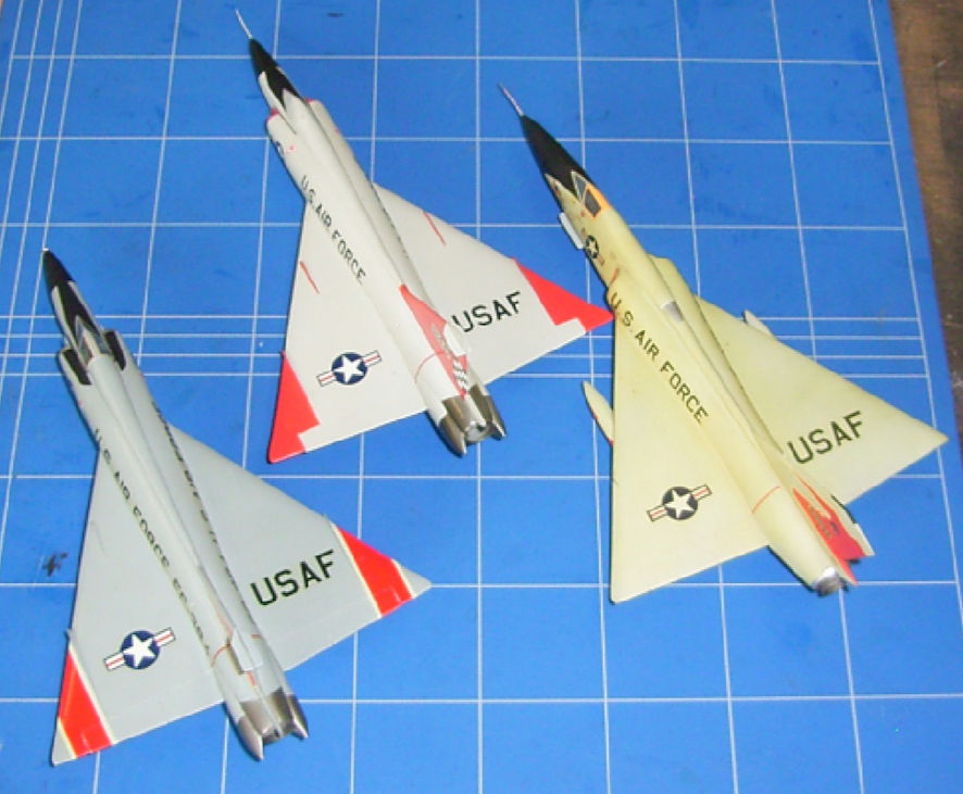One of the problems with my existing F-102 and F-106 models was that I had made them separately so that whatever I decided to do on the day had not been repeated later on. So, even if I came to the wrong conclusions this time around, my new F-102 and F-106 models would look the same by being made at the same time. It then occurred to me that the USAF Air Defence Command also flew F-101Bs so if I also made that model, all three would look the same, no matter how wrong my decisions on these three conundrums might be. As part of the research I read all the kit reviews I could find on the internet, they all said that the Hasegawa F-102 and F-106 kits were ancient and we needed new and better kits, but they were simple to construct in comparison to the Matchbox kit of the F-101 which needs a bit of work to bring it up to the same standard as the Hasagawa kits. But, having got the three models to the painting stage, it was time to confront the three conundrums.