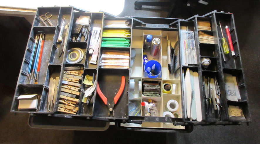 Now that we have moved into this new place I have the space to bring out my big old fishing box and recommission it. I still have the little metal cabinet under my desk and other space I can use, for once I feel as though I have more space than I actually need. This is not true of course, all modellers know that their hobby expands to take up all the space that it available for it. The really nice thing about my box of tools is that when it is open I can reach into it and instantly pick up the tool that I need at that moment without shuffling around looking for it. This luxury is backed up by my ten draw metal cabinet in which I can now keep all those rarely used tools such as I dental probes where I will be able to find them fairly easily on the odd occasions when they might be just the right tool for that unusual job.
