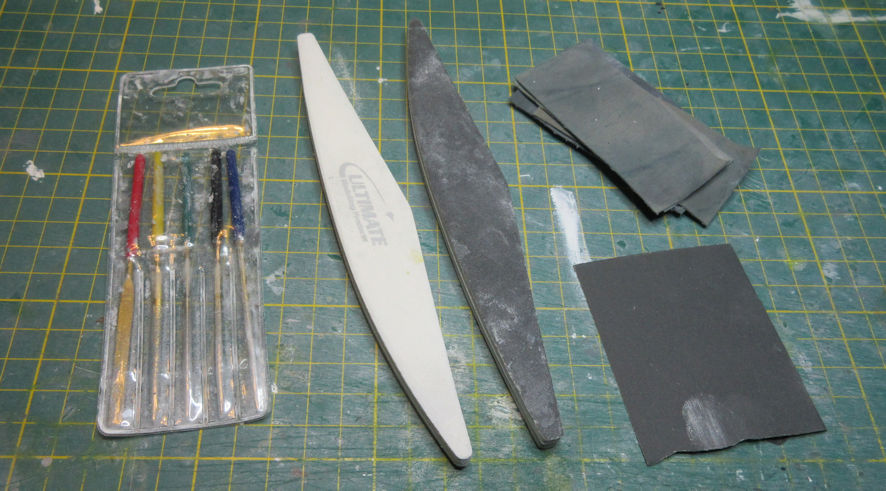 I’m putting sanding and filing together because they do the same thing but in slightly different ways. If you want to do things like remove surface detail and smooth off surfaces you want something that removes material in a controlled way. The simplest way to do this is with a piece of wet and dry sandpaper that you can buy at your local hardware shop. I cut a sheet up into smaller pieces which are easier to store and use. If I wanted a firm backing for the wet and dry I’d wrap a piece around an old file I had but the modern sponge sander is much more convenient so I use them these days instead and that old file has now been relegated to the bottom of the used tools draw.