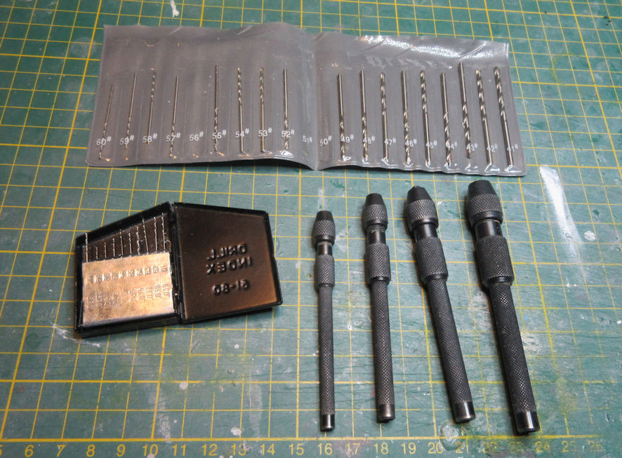 It’s surprising how often I need to make a neat round hole in something, and when that is the case I reach for my trusty pin vices. I guess that they are called that for some reason lost in the mists of time, they are basically small drill chucks that you use to hold tiny drills. I have half a dozen of them but the ones that get used most often is a set of four of varying sized I bought from Micromesh many years ago. More recently I bought another one with a little knob at the rear end so you can twist it around while the rear part sits securely in the palm of your hand. It’s nice but it doesn’t offer the flexibility of the set of four.