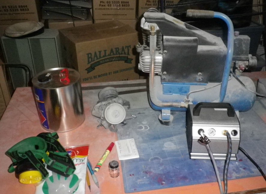 Let’s begin with the equipment. Many decades ago I bought an airbrush and a little compressor that served me well for many years. Then, one day, the compressor chugged its last and refused to puff any more air. After that I had a couple of compressors of dubious worth that drove me nuts. On one occasion I took the offending compressor back to Stanbridges (I was living in Perth at the time) and they charged me a fortune to return it to a semi-working condition. It was a problem with the compressor diaphragm they told me, and even told me how to unbolt the top of the contraption so I could fix it myself in the future. So, when it stopped working again I took the top off again and found the ruptured diaphragm. By that time, however, I was back in Victoria and when I took the diaphragm around the various modelling shops of Melbourne everyone just looked at me blankly and suggested that I go somewhere else.