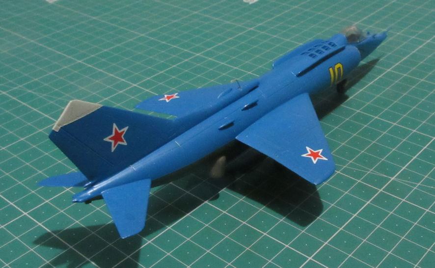 There are weapons pylons and some weapons on them, but from what I read these aeroplanes weren’t very useful for that kind of thing. So the pylons went on but the weapons went into the spares box. The major difficulty with this kit was the finishing. In particular, what colours to paint it. I dug up as many photos as I could of the Yak-38 from the internet. Many of them are from a couple of examples standing in open-air museums, only a few are of operational aeroplanes. Either way, it’s fairly clear that the aeroplane should have some kind of darkish blue on top and a sort-of olive green underneath. The instruction sheet isn’t much use because it doesn’t notice the green and gives the upperside blue as 30 per cent black and 7- per cent blue but doesn’t say what kind of blue the upper side is. One review gave the topside blue as FS35164 whish is a reasonable compromise between the colour variations in the various photos but that number implies a matt finish while most operational Yak-38s seem to have been glass or semi-gloss. In the end I settled for a compromise between all the possibilities that suggested themselves. Who knows which is right.